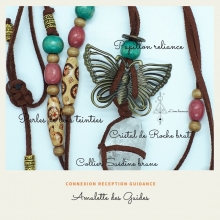 Son caractère particulier: Le double pendentif :le papillon en métal cuivré estampé dont la présence renforce l'esprit de la métamorphose, le cristal de Roche brute de 3,5 cm qui est la pierre des Chamanes, utilisé pour son aide dans l'élévation de l'esprit et la captation de la lumière Divine et Sacrée