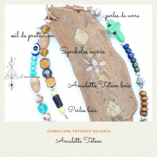 Son caractère particulier: Le morceau de bois flottée qui vient d'une cascade d'Auvergne abritée et presque secrète, sa perle d'œil bleu de protection, ses liens en cuir fins, ses dessins Totems dorés.
