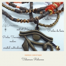 Pendentif œil d'Horus laiton doré, perles tissus, , perles de bohèmes en verre, perles semi précieuses tourmaline melon facettées 4 mm, perles de bois de Coco, perles de rocailles, perles de Cristal Autrichien.